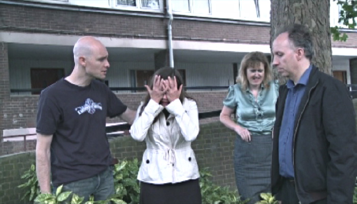 By contrast, George Barber’s Gibberish is a film with a narrative at its heart, but one that replaces meaningful dialogue with a nonsensical mixture of English and improvised mouth-noises. The sounds emitted by the actors in the place of conversation make it almost impossible to decipher the storyline. Combined with its saturated colours and limited cast, the film has the appearance of a mediocre daytime drama. Gibberish throws you off balance as a viewer, ready and waiting for the sort of forward momentum that is the basis for many daytime television programs. Unlike these shows, however, Gibberish exists as a site not for the creation of a convoluted narrative, but to examine the breakdown of language when it is relieved of meaning. Your mind tries to square the occasional sentences in English with all the nonsense words spoken alongside them, an attempt at recognition of a linguistic structure that doesn’t actually exist. Contiguity and causality trip over themselves in an attempt to impose meaning on what you see and hear, yet fail to do so.