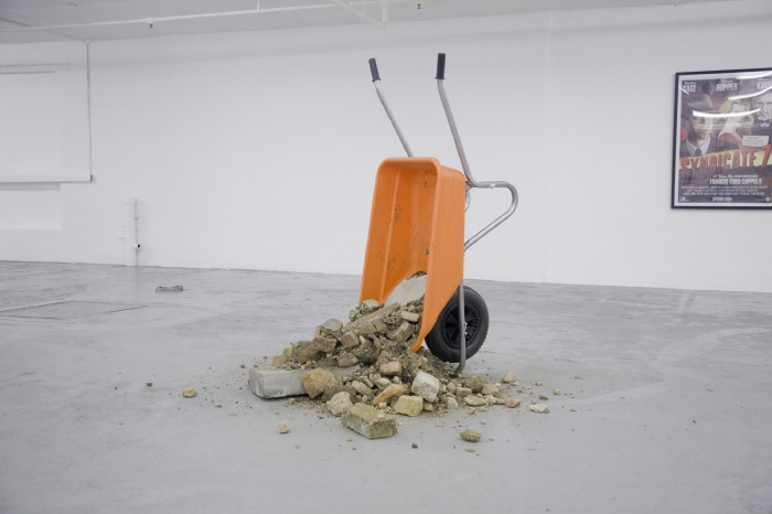 While Sunderland very clearly induces the fear of an IKEA shop floor, Graham Hudson calls to mind a construction site. Sculpture LXI: Local Survey (wheelbarrow / performance documentation) also looks out of place in a gallery, as if the artist got lost on the way to the skip. The rubble and detritus that spews forth from the upturned wheelbarrow has been collected from the area surrounding Waterside Project Space. Although it has been carelessly dumped in the middle of the gallery, we are actually looking at a closely observed survey of the local area. With his previous use of scaffolding and his current residency at the site of the King’s Cross redevelopment, Hudson tends towards the idea of manual labour as artistic process. Like Jorge Luis Borges’ Pierre Menard, Author of the Quixote, Hudson decided that the original object that inspired him to make this work - which was created by accident whilst working on another piece at the King’s Cross site - was so perfect, that to exhibit it as art, he would have to re-enact the situation which brought it in to being. Hudson is more method actor than builder, and this idea of re-enactment or re-interpretation complicates the authorship of the piece. This rejection of the philosophical naivety of direct representation is found in many of the works in {Empty Sets}, but instead of distortion or abstraction, the artists make pragmatic choices of how best to realise ideas that have been discovered elsewhere.
