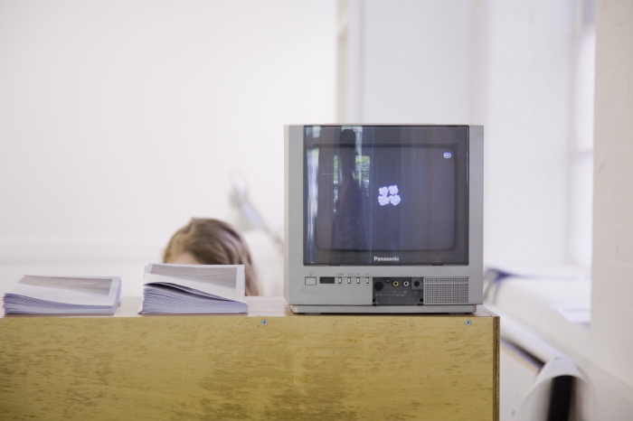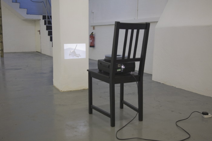 Andrew Sunderland investigates purposeless activity with Cahir. Sunderland rearranges the components of an IKEA chair; it appears before us, in slide-show form, as a sort of pathetic Rubik’s Cube. Every permutation, every combination of elements is explored, but never the one that would allow the object to assume its intended purpose: to function as a chair. Each of the slides is a unique still life, but the compositional changes between them are often imperceptible and only serve to highlight Sunderland’s wilful, obstinate refusal to follow the instructions. The use of such a generic, and yet easily recognisable piece of IKEA furniture allows us to use the slide show to meditate on the specific historic and cultural meaning of IKEA’s ubiquity. The little pencils, the cheap hot dogs, and the sudden and total onset of boredom and panic in the kitchen section are missing from the gallery space; yet IKEA is such a present cultural force that to evoke this setting, you don’t have to be in the store.