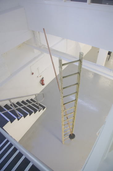 This phasing-between state that Rice’s work achieves results in a highly unstable existence, an existence that is shared amongst many of the works in {Empty Sets}. In the case of Sam Zealey’s Middle Ear, this instability manifests itself in the accumulation of potential energy; the release of this energy would result in the work literally collapsing to the floor. Like Chris Burden’s Samson (1985), where a jack suspended between the walls of the gallery expanded each time a visitor entered, this preconceived instability in the artwork creates a strained, tense relationship between the artist, the object and the viewer. Middle Ear thrusts you into a confrontational situation whereby the sculpture is uncomfortably invading your space as you descend into the gallery. The careful balance of the ladder and the weight from the copper pipe is confirmed as possible by our eyes, but completely thwarts our common sense. It is uncanny and absurd. Zealy presents us with an experiment in gravity with no discernible purpose other than to reinforce the most basic and well-understood theory of physics.